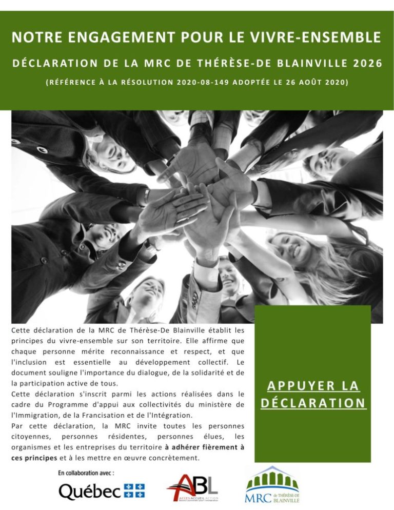 La déclaration de la MRC de Thérèse-De Blainville, adoptée en août 2020, établit les principes fondamentaux du vivre-ensemble sur son territoire.